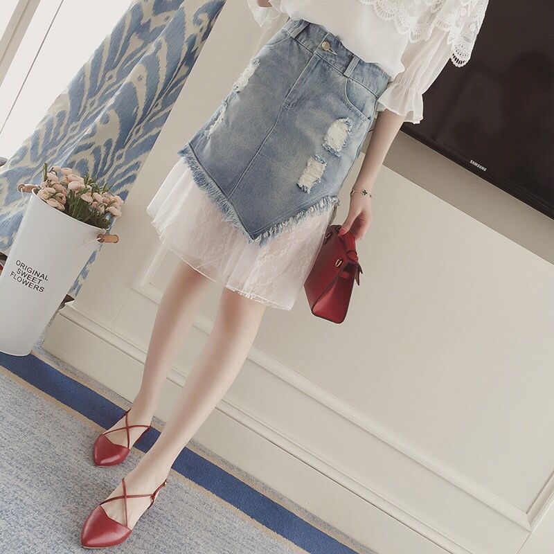 时下大热的破洞牛仔裙,已经收获了大批MM的芳心。帅气张扬,随性不羁,OR甜美可爱,这款拼接了蕾丝网纱的牛仔短裙。今年流行绑带连衣裙搭配,穿出夏日小清新