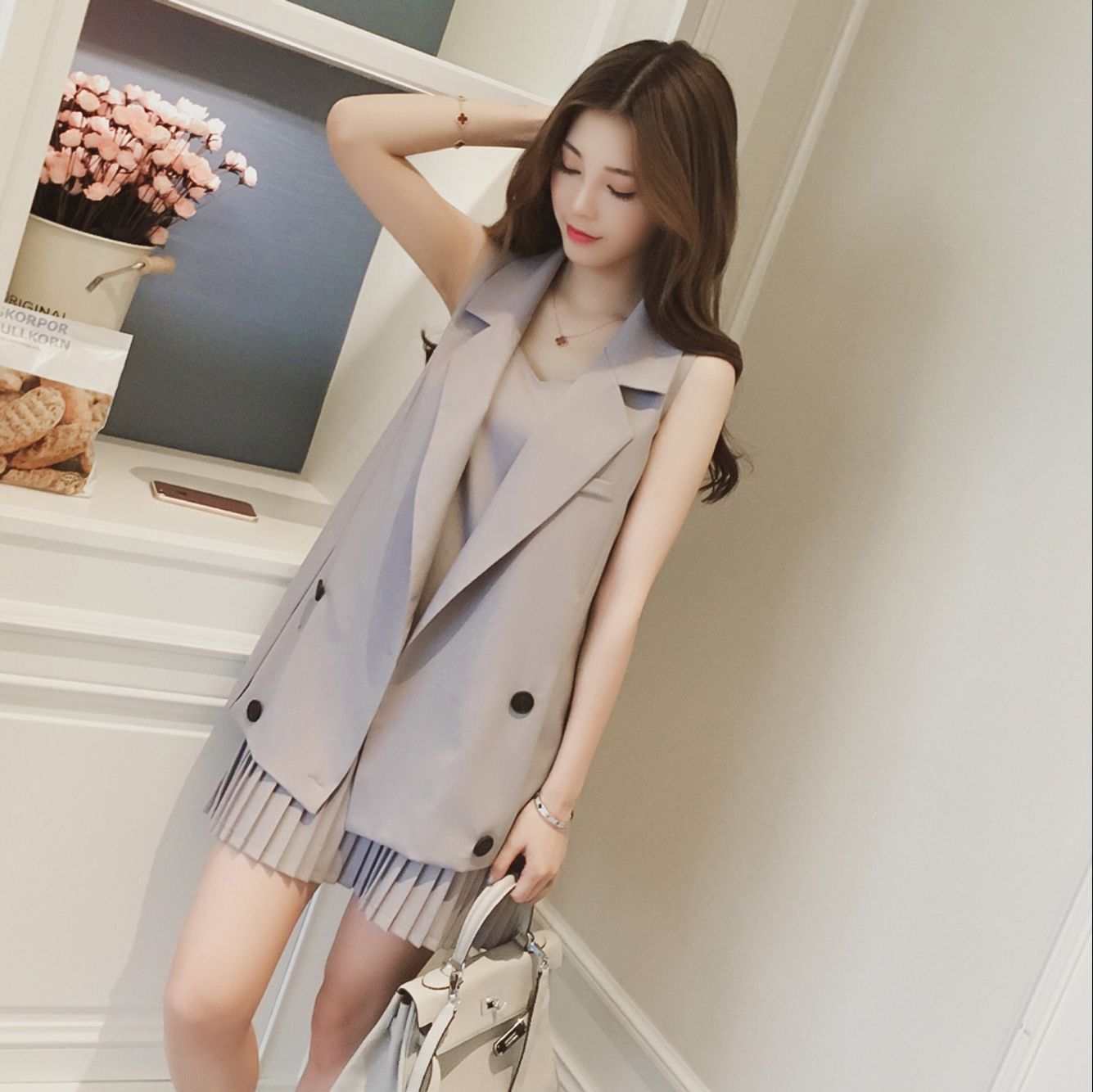 百褶吊带裙+西装马甲两件套~字母肩带搭配百褶的设计,显瘦遮肉同时增加了俏皮感。马甲双排扣的设计英伦风范。