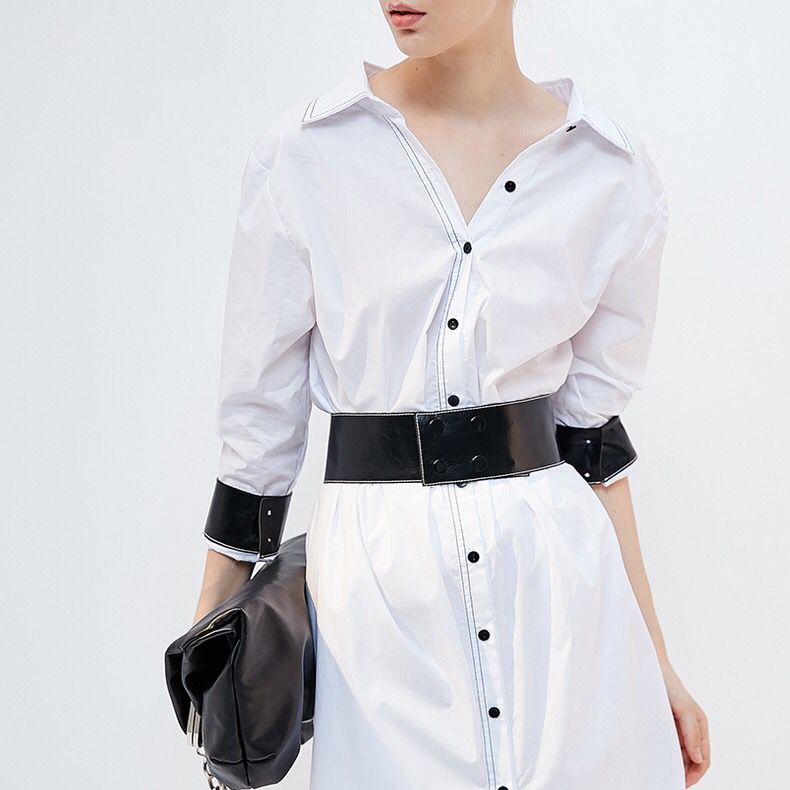 简洁规整的白衬衣版式,但设计上的小细节又增添了时髦的大牌范,袖口及腰带的拼皮设计,给大大的白衬衫带来更多的造型可能,大大的宽松款白衬衫,带着独特的女人风格,领口的明线设计也是时髦的不要不要的。