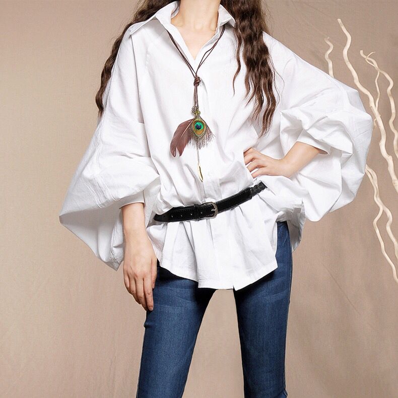 很有个性的一款反传统衬衣,宽松的蝙蝠型,配上一条休闲皮带,或者把下摆系起来,又或者把它塞进裤腰,怎么穿都很有个性。大大的灯笼袖,带来浓浓的宫廷复古风,宽松简约版型不挑身材,穿起来更加随性百搭。