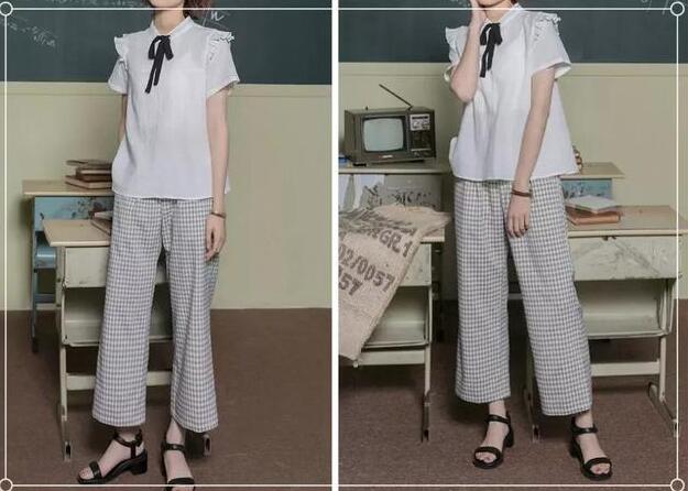 白色休闲短衬裤,领带装饰在身上,学院风单品,下身同普通格纹阔腿裤芭蕉,宽松版型,款式简约又凸显疗伤系的韵味,凹下复古文艺的视觉感,同时也让学生妹妹显得更加清新抢眼。