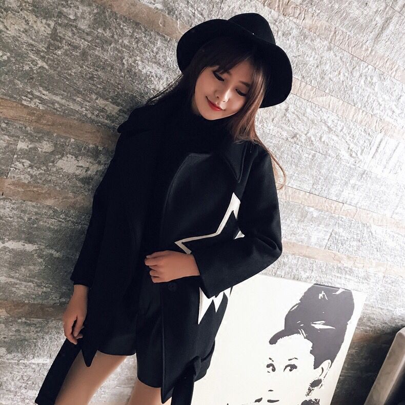 很时尚的一款短款大衣,不过因为系带在衣摆处,所以小编认为这款大衣收腰的效果并不突出,但是好在是黑色调,所以能够起到显瘦的效果。