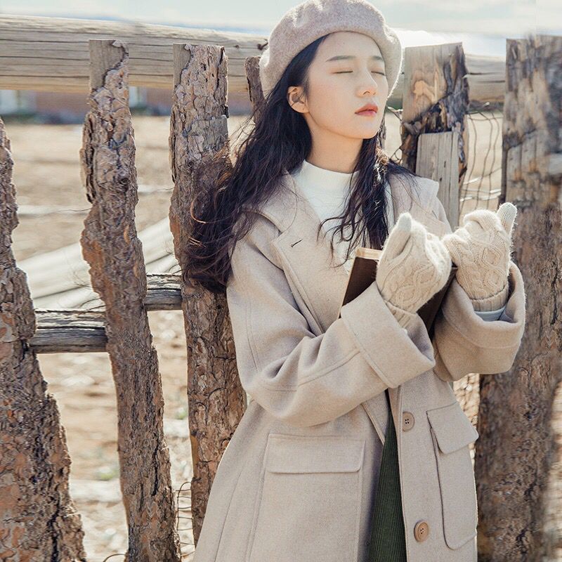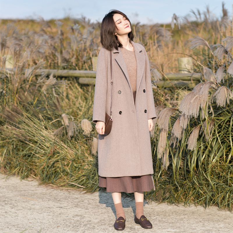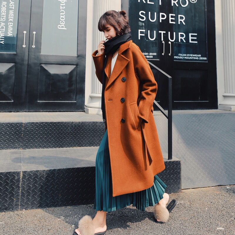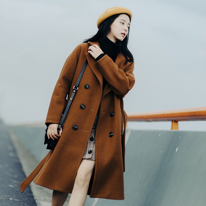 甜蜜的焦糖色,低调沉静,美丽而不张扬,而且更突显白肤和美貌。简单大方的长款大衣,经典翻领,略略宽松的版型更增添一抹优雅;手工缝制的羊毛呢大衣,走心的手工走线,厚实温暖。立体的剪裁,双排扣工艺,腰间腰带的利落设计, 内搭一件纯色毛衫,下身搭配一件百褶长裙,衣摆摇曳更加具备立体层次感,优雅别致~