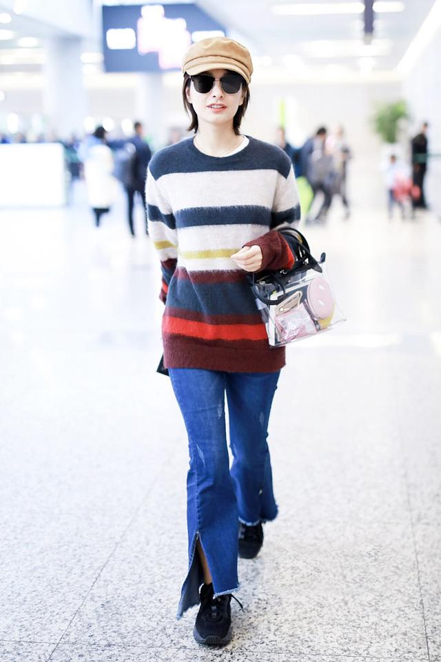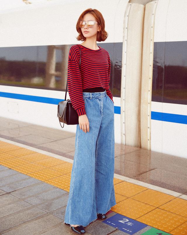 喇叭裤是近些年又重新突围而出的热门款式,大腿处至膝盖处渐窄、膝盖至裤脚处渐宽,很好的将你的大腿赘肉、小腿壮实、O型腿、X腿等问题掩盖,是一款可以完美修饰腿型的裤子款式。喇叭裤中也有宽松与较为贴身的款式,若你的大腿较为粗壮,建议选择宽松款式的喇叭裤,上身时髦显瘦且舒适感满分,建议搭配可以提升你气质的细高跟;腿型较为纤细的女性,贴身款与宽松款都适合你,贴身款会具有更多的女人味,宽松款则偏向休闲复古风。婚前婚后同样美丽的刘诗诗在搭乘高铁时也不忘秀一下自己的时尚穿搭,宽松复古的高腰喇叭裤搭配红黑条纹撞色T恤,时尚感爆棚。