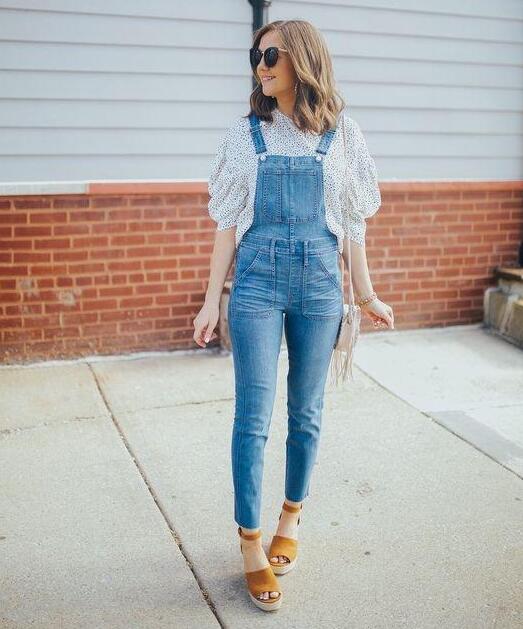 今年流行的工装裤,运用在背带裤上,也恰到好处,对于身材瘦小的女生来说,十分的长裤过于拖沓,反而显矮,不妨尝试一下九分裤,露出细小的脚踝,显瘦显高。