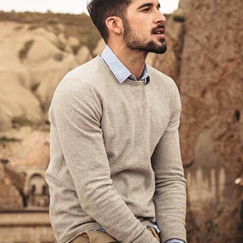 穿上去很绅士的一件针织套头衫,领口袖口还有衣摆处的卷边设计,都很独特时尚,看起来很有文艺气质。天稍凉的时候可以在里面穿上一件衬衣,暖和的时候单穿就可以了。