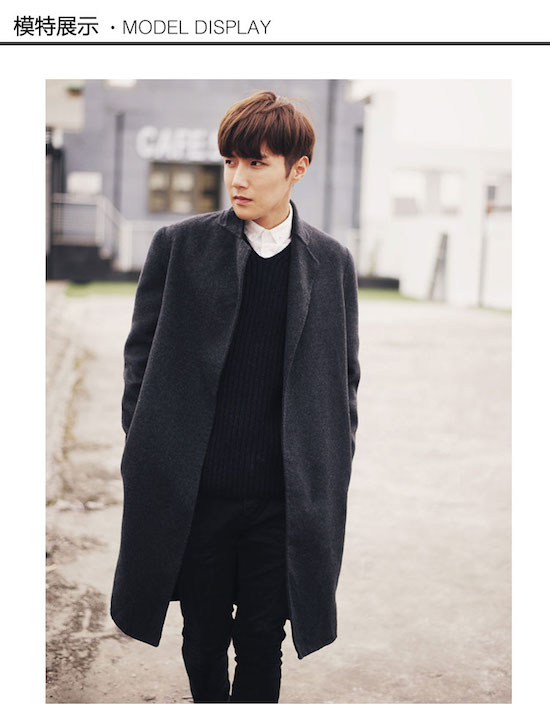 4.矮个子穿中长款的大衣,其实长度刚好。不显长也不会短,同时宽松的版型,可以显示男生的随性洒脱范。同时还可以内搭各种衣服,纯色最为经典百搭。虽然是这个图是模特穿着,但是小个子穿起来也有大长腿的即视感。
