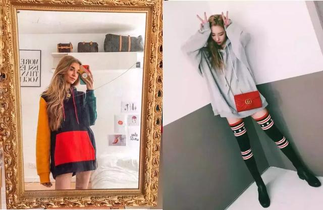 这种穿法真的不要太流行,很多女明星的机场照就是洗衣失踪,性感又能显身材。长款卫衣也不用搭配那些紧身牛仔裤或打底裤,完全可以hold住整体造型。三色拼接款长卫衣,搭配安全裤就能高亮出街,就是会被路人要链接的穿衣水准。单调的灰色长卫衣,搭配个性长筒袜,性感可爱两手抓,还能穿出大长腿。