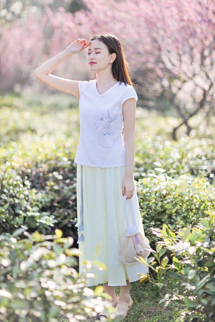淡淡的水墨风,浓浓的古典情,花香染襟,花苞短袖,若君不解花语,一朵菡萏轻盈婀娜,像是佳人回眸浅笑,惹人欲醉,悄悄拨动的是心底的柔情。搭配飘逸的半裙,最堪留恋与回味的印象,玲珑而从容,心中不禁轻轻吟起张子野的词句,水天溶溶画桡迟,人影鉴中移。