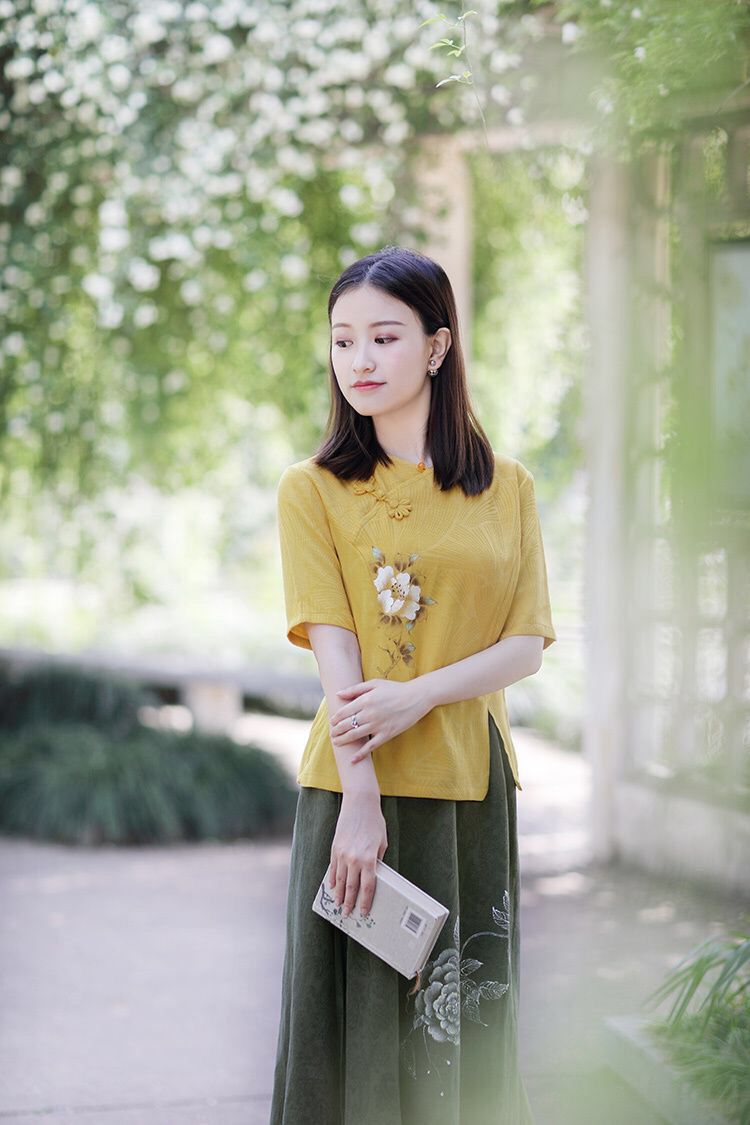 明丽与清纯,温馨与轻柔,明黄色的棉总是浮漾着古典的美,盛开的牡丹似在幽幽低吟,也似明朗的微笑,精雕细琢般的无所不在的精致。搭配灰绿长裙让人有着澄碧的心情,像是流荡在眼眸里的夏日午后的微风,感官的愉悦和闲适里,心也就静了。
