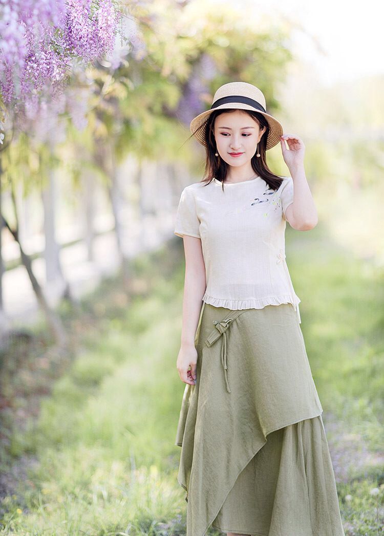 奶茶色的棉麻上衣,可以非常好的秀出佳人上身线条,玲珑细巧,复古细节的圆领和斜襟,别有俏丽,使人感到一种并不遥远的亲切。搭配白色的半裙,清丽而淡雅,追求的永远是一种简单而永恒的情调,清雅的夏日色彩里,依然有着富丽和轻奢。