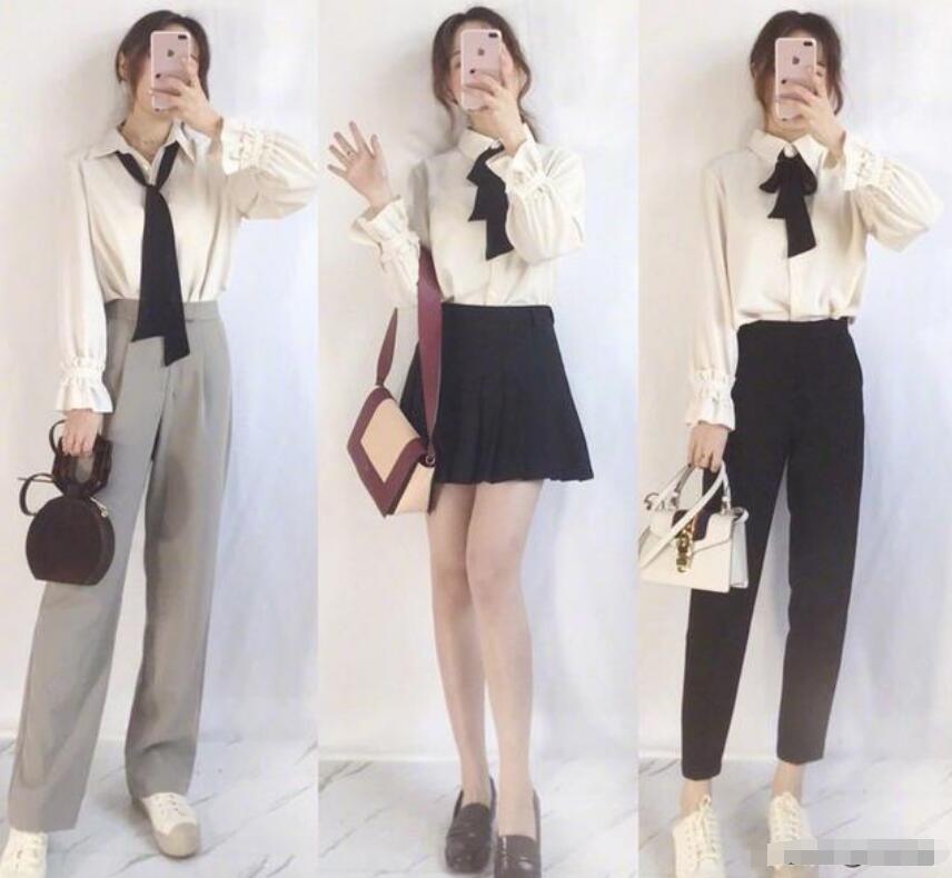 大家都知道搭配的诀窍在于让人有一种眼前一亮的感觉,那么在基础的衬衫单品之上我们如何才能做到有亮点?如果你无法在颜色上实现跳跃,那么可以在装饰上下一些功夫。白衬衫和黑领带形成颜色的鲜明对比,一眼就能让人看到你的穿搭重点。小翻领乖巧可爱,甜美风十足,扎一个低马尾简直就是活脱脱的小学妹,这一身很适合职场新人。用来搭配白衬衫的单品也是数不胜数,拖地裤、百褶裙、锥形裤都是很好的选择,这完全取决于你的腿部条件如何。总之有白衬衫加持的穿搭,整个人会充满青春活力,这是毋庸置疑的。