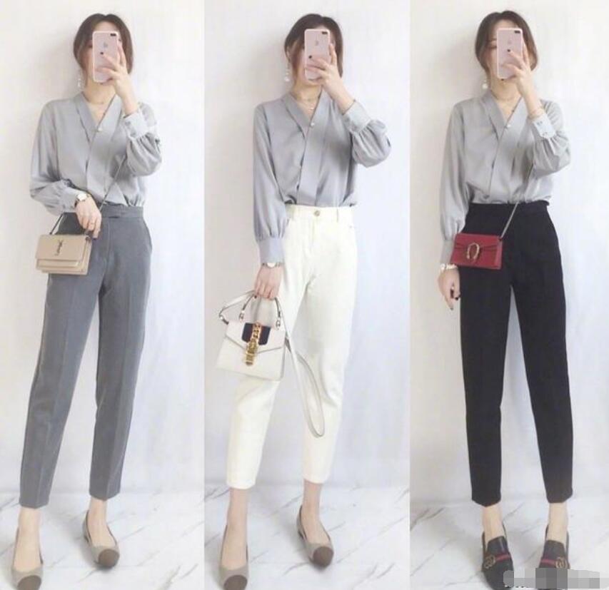 灰蓝色作为一个基础色在日常搭配中很常见,但是作为衬衫,这个颜色与单品碰撞时还是比较有新意的。尤其是领口处的交叠设计,配上一颗小珍珠点缀,更加精致耐看,形成的小v领也能很好的修饰脸型。手表、戒指和耳环能给整个人都加一些印象分。作为基调的灰蓝色,使得这三套服装的风格就是珍珠般的高级感。而这种颜色饱和度较低,所以在颜色搭配上也不会有太大的问题,只要是基础色基本上都可以很好地驾驭住。