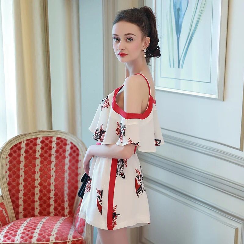 连体裤加上吊带露肩的设计,真的不要太时髦,印花款,远远看是蝶恋花枝的图案,近看才发现蝴蝶印花别有乾坤哦。