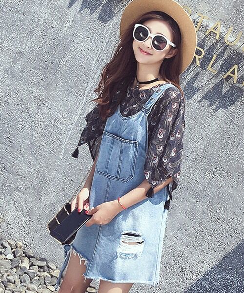 裙身有破洞设计。 除此之外牛仔的边缘做了一些设计处理, 比如磨边和流苏,以及底摆的小拼接。要知道中规中矩的时髦现在已经不太受欢迎了。