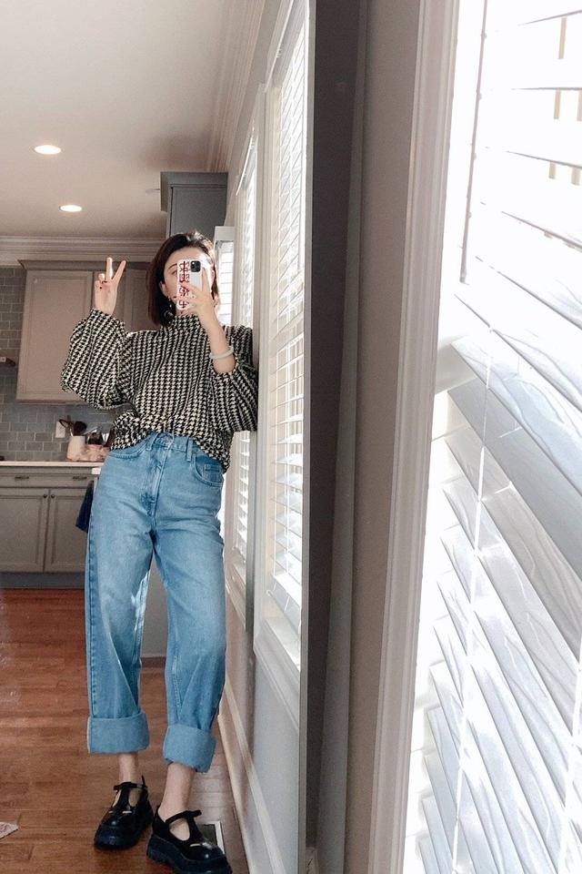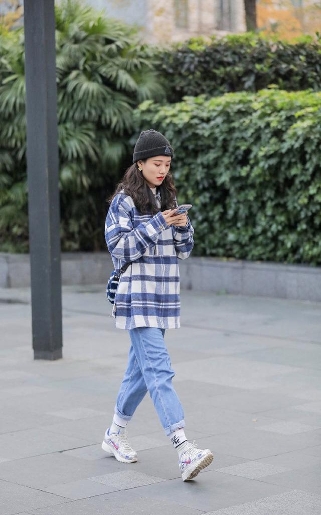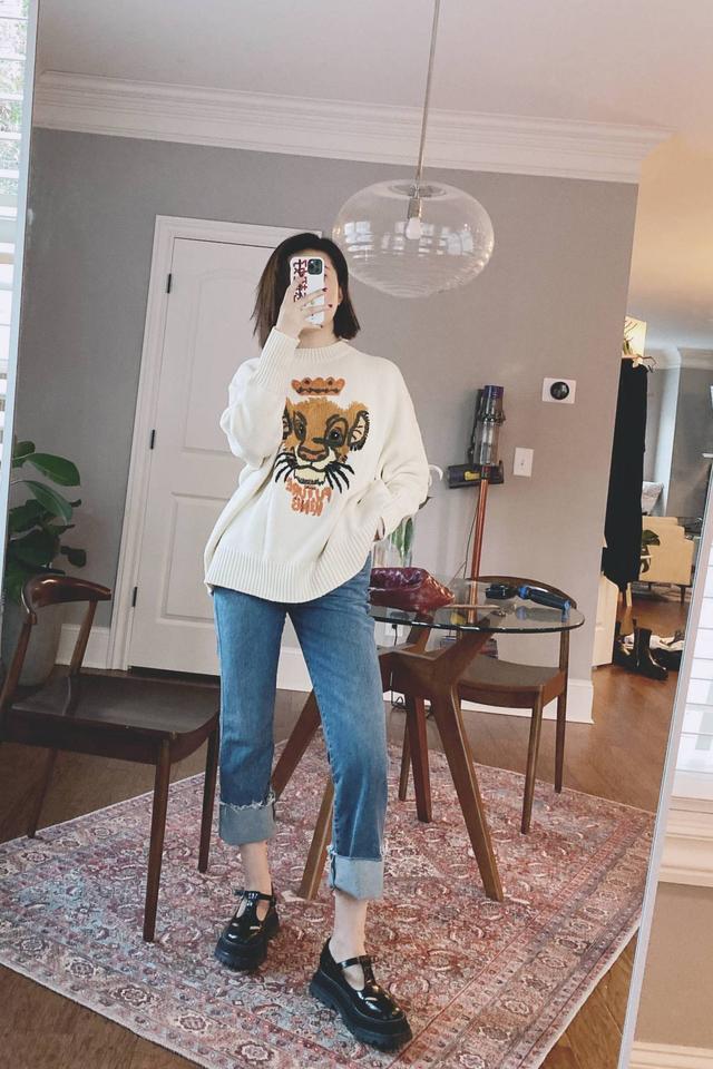 裤腿挽半截的穿法,在服装搭配的时候也是变化多样的。像这样搭配印花毛衣加厚底鞋,更加清纯减龄。印花毛衣彰显着青春时尚的气息,厚底的鞋子更加显高。一般而言如果你穿小脚裤搭配厚底的鞋子可能会觉得累赘,有种头重脚轻的感觉。但这样的直筒裤又选择挽半截的穿法,视觉上还是有些厚重感的,所以即便是搭配厚底鞋,也不会有累赘臃肿的感觉。