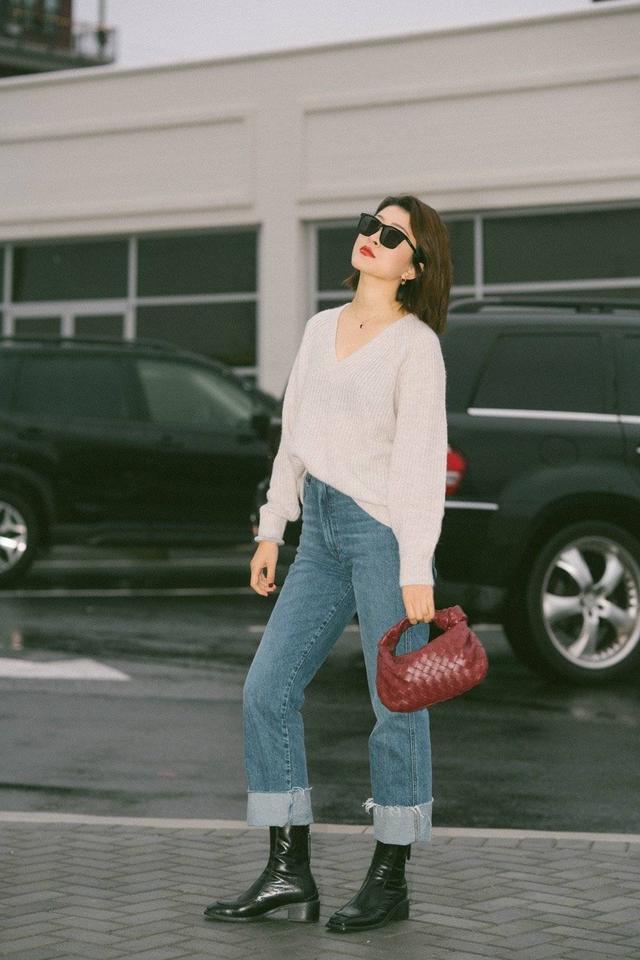 复古的蓝色牛仔裤,搭配一件V领针织衫,时尚又优雅。这样的复古蓝牛仔裤,显然裤腿是有些长的。小姐姐选择直接挽半截的穿法,搭配一双及踝靴,超级时尚显腿长。这样的穿搭对身材一点都不挑剔,不管你是胖一些还是矮一些,都可以选择这样的穿搭方式。因为挽半截的裤腿,不仅个性时尚。而且超级显高显瘦呢,像小姐姐这样搭配黑色及踝靴,更是港风十足呢。