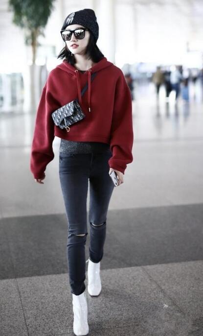 小仙女除了最经典的蓝色牛仔裤外,那要数这款时髦的黑色破洞牛仔裤啦!短款酒红色连帽卫衣,搭配黑色破洞牛仔裤,尽显优雅干练气质,你心动了吗?黑色的毛线帽更是增添一丝温暖感。脚上的白色短靴,不仅御寒,更是将帅气挥洒得淋漓尽致!