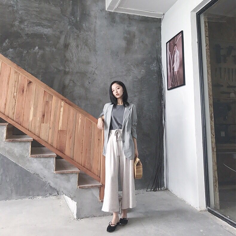 没什么色系不可以搭配的了,跟针织阔腿裤相比,这款是8分的,并且挺阔一点哦,上身可以搭配出比较正装的感觉。