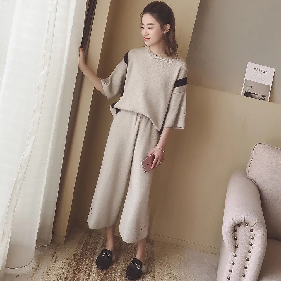 两件套合身版型,上衣为针织衫,时尚优雅的圆领,五分袖袖长,袖部镂空金属装饰,更具造型魅力!衣身撞色拼接,增添看点,个性十足~宽松的版型,遮肉显瘦,下搭针织休闲裤,松紧收腰,细致腰线,穿着自由,不约束,方便穿脱,九分裤裤长,露出纤细的脚踝,阔腿裤版型,遮肉显瘦,慵懒随性的两件套,搭配更省心哦~推荐~