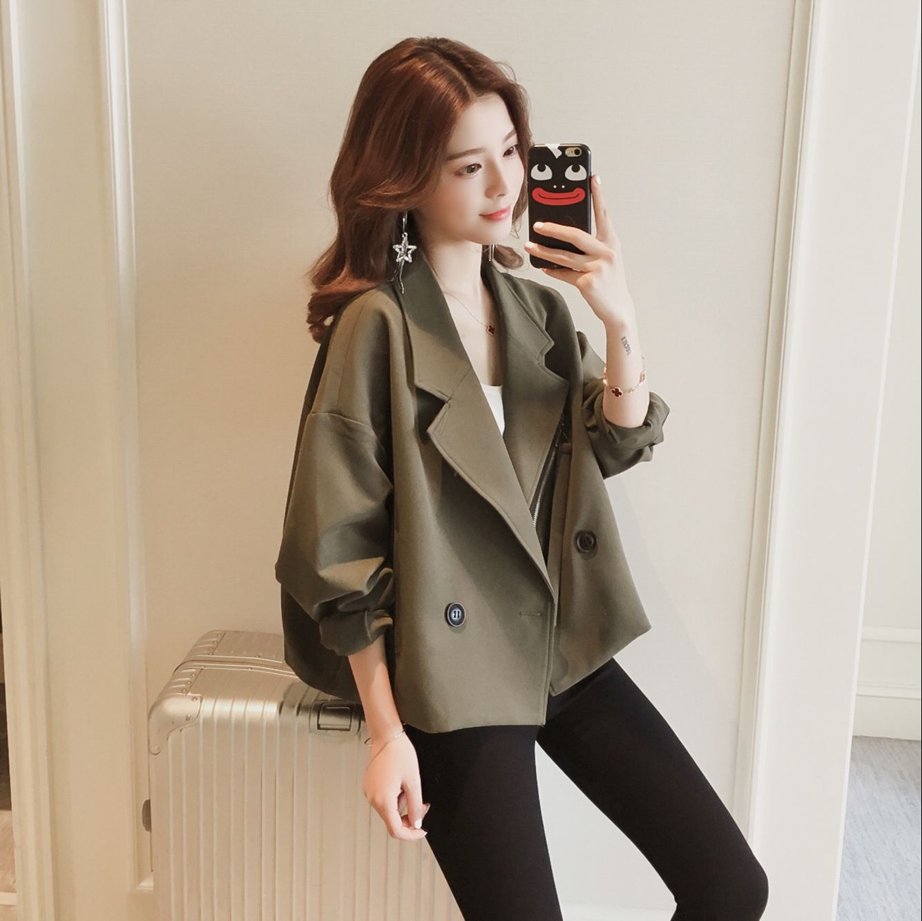 不要总是长款的风衣好吗?偶尔也来一件小短款。这件短款的风衣给我眼前一亮的feel,西装领简单大方,宽松的版型,谁都不挑好驾驭。英伦风纽扣的设计,袖子是有点大大的,袖口纽扣可以调节,比较休闲有味道的一件外套。短款的版型穿一条紧身的裤子,给人的感觉就是显高还显瘦,这件风衣外套hin推荐小个子的宝宝哦~穿上高跟鞋,演绎秋日新时尚!