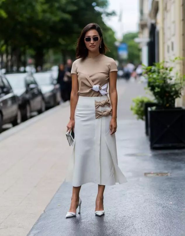 像T恤这种本身没有腰线的单品,搭裙子时抓住腰线的位置很重要,毕竟腿长不长,有时候是腰来决定的。小个子女生还可以穿短款T恤或者打个结,你以为我是为了俏皮?我是为了显高!