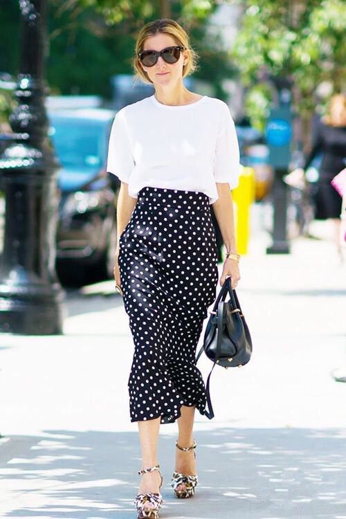开衩裙也是那种进可攻退可守的单品,用T恤搭配它不会太板正也不会太随意。开衩裙会露出更多腿部,为了线条好看最好穿一双高跟凉鞋。