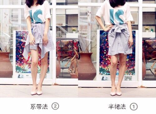 穿法①:将衬衫(中长基础款即可)围在腰间,系起纽扣,整理好衣领,再将手袖系成蝴蝶结,就变成甜美时髦半裙,很惊艳有没有?