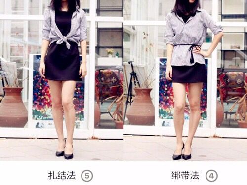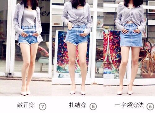 穿法⑤:将衬衫两边衣角系起来,是很早就流行的穿法了,既休闲随意,也有拉高腰际线的效果,心机显高哦!