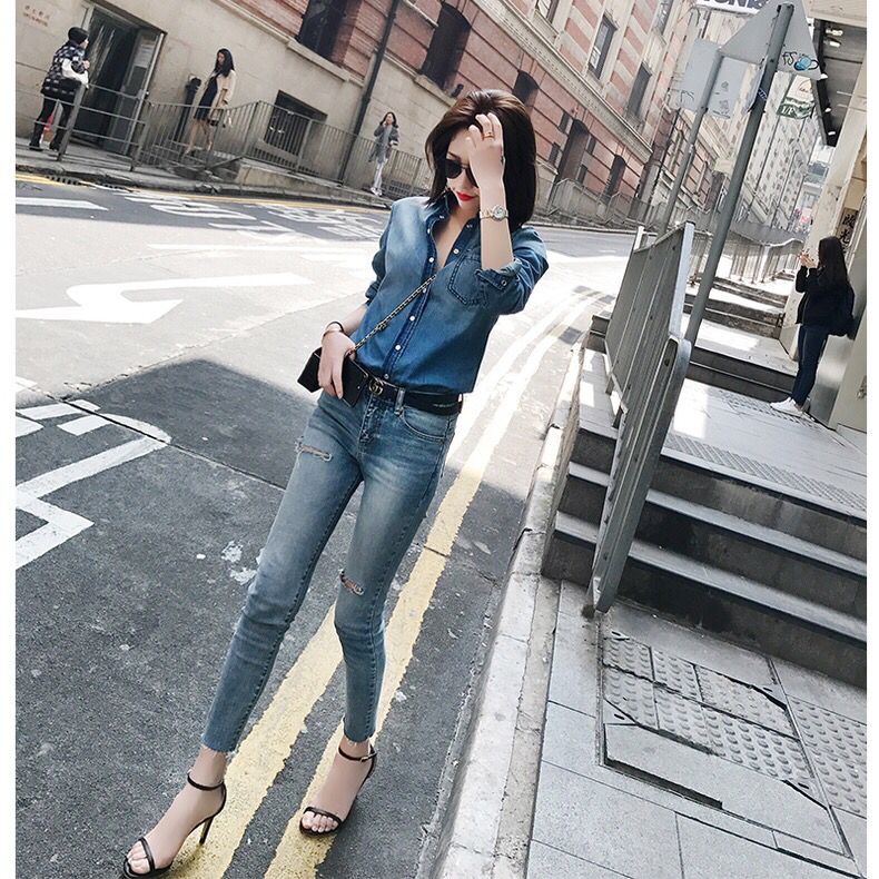 穿法⑥:将中间的几个扣子扣起来,衣领拨开成一字领,搭配牛仔裤或者短裙,特别时髦,也显得性感甜美!