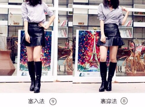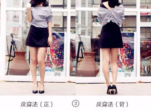 穿法③:这种是近年来才流行开来的穿法,将衬衫反过来穿,可以少系一个扣,变成一字领衬衫,既性感又特别,搭配短裙,凸显女人味。
