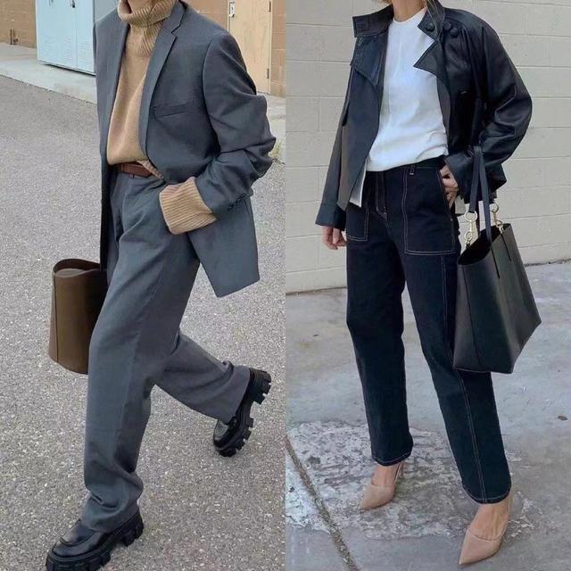 灰色是十分高级的颜色,也是中性风的代表,焦糖色的毛衣,给人一种比较温暖的感觉,又是有一种中性感,搭配灰色西装套装,给人一种清冷的中性风,很有气场,很适合职场穿搭。皮衣就是酷帅的代表,纯白色的内搭百搭,深蓝色的牛仔裤,工装大口袋的设计,时尚又帅气,简单的线条设计,让整体的搭配显得比较立体,一双藕色高跟鞋,又是多了女人味,既帅气又女人。