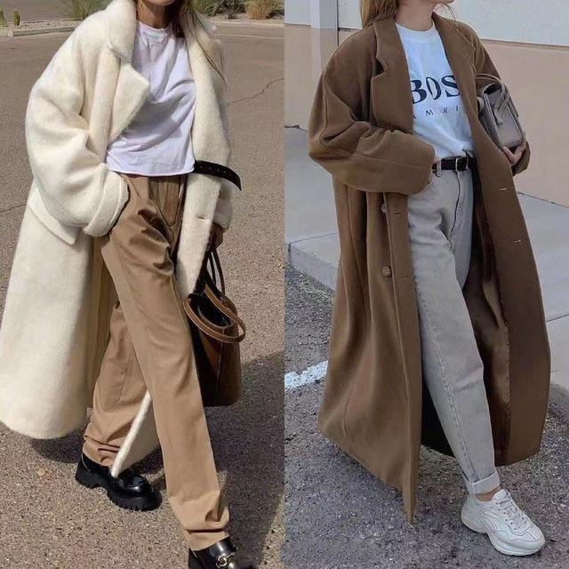 白色的短款T恤,俏皮又随性,搭配一件卡其色长裤显高又显瘦。长款白色的外套,毛绒质感,大翻领的设计,有气场但是又带有一丝丝的可爱。温暖时尚。同样的长款宽松大衣外套,焦糖色总是给人一种沉稳又成熟的感觉,用白色的内搭来平衡这一特点,白色的T恤,简单的字母款式,搭配同色系的牛仔裤。外套的搭配增添了几分的气场,简单帅气。