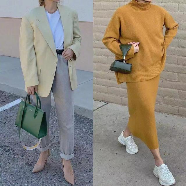 绿色的单品可以简单的对整体搭配起到一个点睛的作用。嫩绿色的西装外套,颜色不会特别的鲜艳,比较低调又不失时尚。内穿一件白色T恤,搭配米灰色的牛仔裤,简单高级又有气质,一双细高跟的搭配多了气场。绿色的包包作为点缀,时尚休闲的商务风。同色系的针织套装,黄色的毛衣搭配黄色的针织裙,温暖柔美,又不失活力,一双白色运动鞋的搭配更是多了几分休闲,手腕皮质小绿包,俏皮又气质。