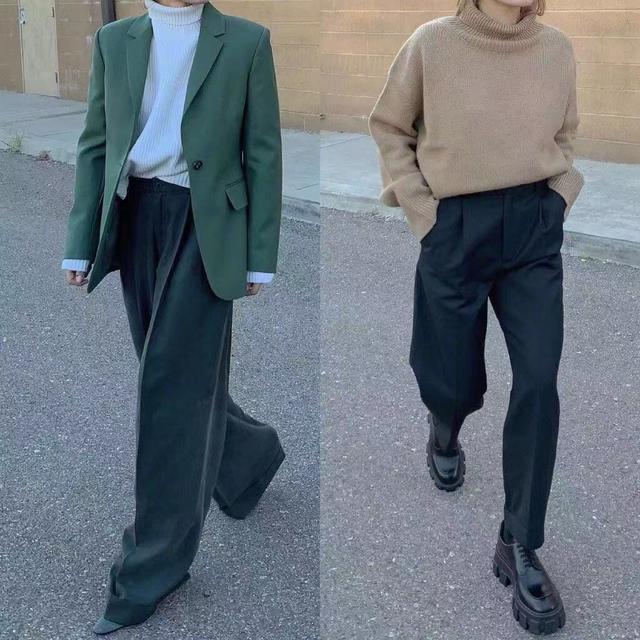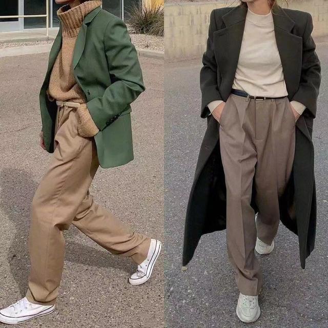 绿色系的搭配,白色的高领毛衣,简单高级,也是一件百搭的单品,细条纹式的设计有一种中性风的感觉,搭配拖地长裤,长裤的垂感多了几分的随性自在,外穿一件绿色西装,绿色的设计让西装不会显得特别的古板,反而十分的时髦,整体的搭配有气场。卡其色高领毛衣,高级低调,搭配黑色西装裤显瘦,一双厚底皮鞋,复古又时尚,整体的搭配帅气高级。