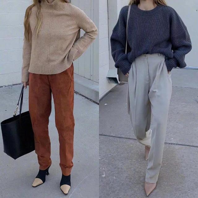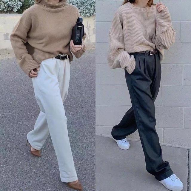 毛衣搭配长裤。卡其色的高领毛衣宽松的款式,多了几分的柔和又高级,搭配白色长裤,简直就是气质满满,干净利落。圆领的灯芯绒款式的毛衣,宽松设计,慵懒休闲,搭配黑色西装想哭,腰间的皮带搭配,复古中性,帅气又随性。
