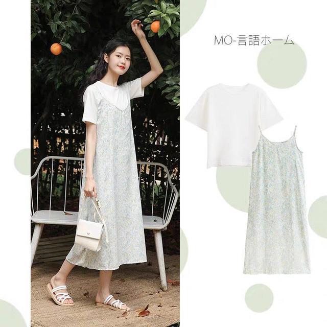 白色短袖T恤简洁而优雅。它有一种纯天然的自然感觉,那朴素典雅的样子显得特别纯净。搭配外面一条浅绿色的吊带裙,浅绿色是那么清新,美丽的春天透过穿搭完全渲染出来,是那么简单。