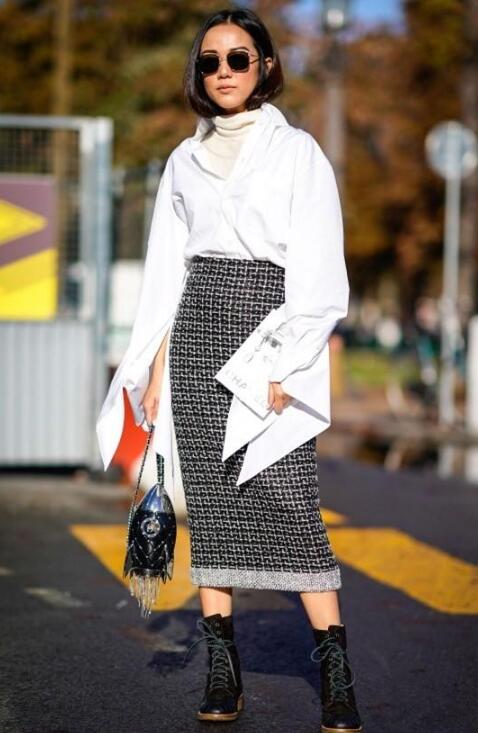 毛呢长裙pick衬衫,轻松显高又显瘦,时髦又显精气神。内搭白色单品,这种叠穿的方式,非常有层次感。脚踩黑色的靴子,增加了一股复古感。pick手提包,简约又优雅,让小仙女兼具风度和温度,展现优雅迷人魅力。