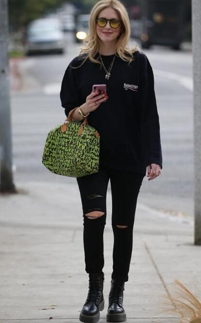 同色系搭配,整体look协调。一身黑的打扮,显瘦效果达到顶峰。黑色的卫衣+破洞黑色牛仔裤,尽显帅气潇洒的气质,透着些许不羁与酷劲,你心动了吗?脚上踩着黑色马丁靴,打造随性街头范,很是吸睛!