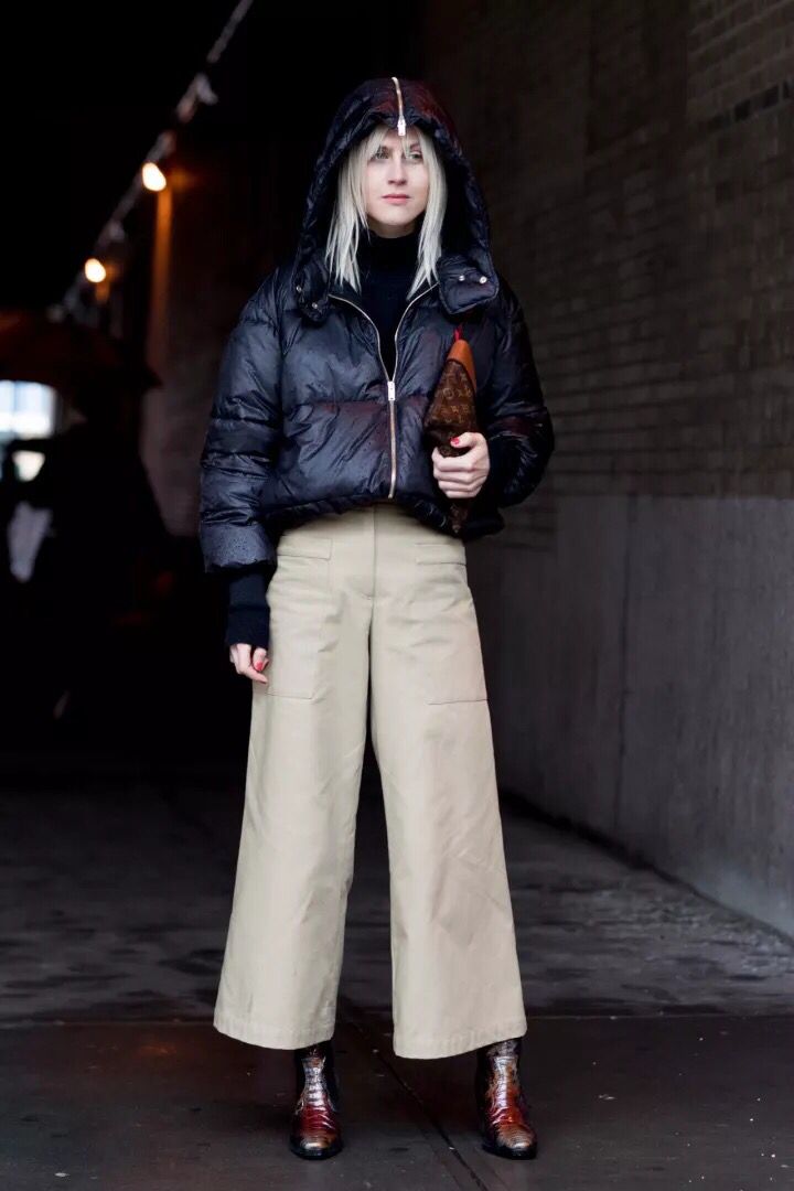 羽绒服搭配阔腿裤,特别显气场,阔腿裤里面还可以偷偷加条秋裤,真是气场与温度兼备,羽绒服可以挑选小短款,这样显得比例更好哦~