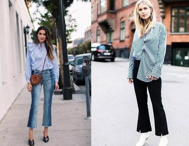宽松的条纹衬衫搭配上一条喇叭牛仔裤,可以说是很时髦了。时下流行的条纹元素,有显瘦上身的效果。而微喇牛仔裤在大腿处完美契合,完美的遮住了让人烦恼的小象腿,这样的一身简直不要太显瘦遮肉呢!
