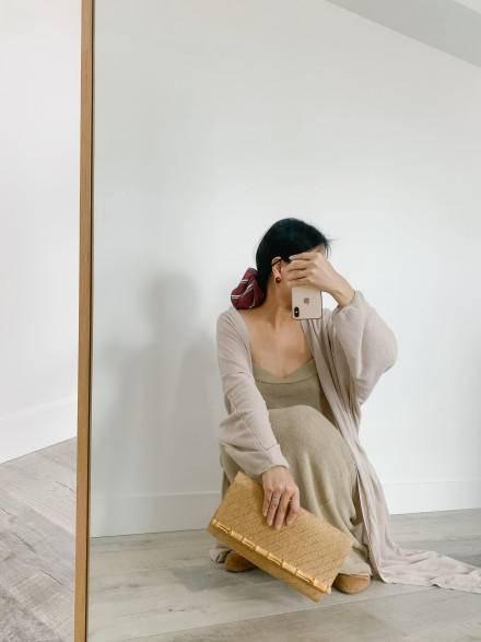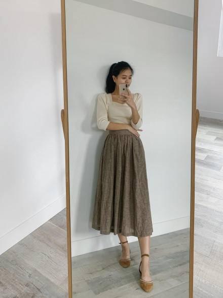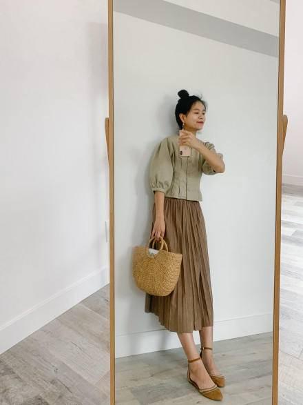 只要掌握好莫兰迪色的穿搭法则,田野风也能很高级。同样是深棕色的百褶半身裙,搭配的中长款灯笼袖的上衣,甜美自然还有格调,田野风必备的手提编织包也选择和衣服配色相撞的亮桔色,视觉上的明暗冲击使整套穿搭优雅又高级,有麒麟臂和大腿粗的姐妹可以试试,不仅高级还甜美。