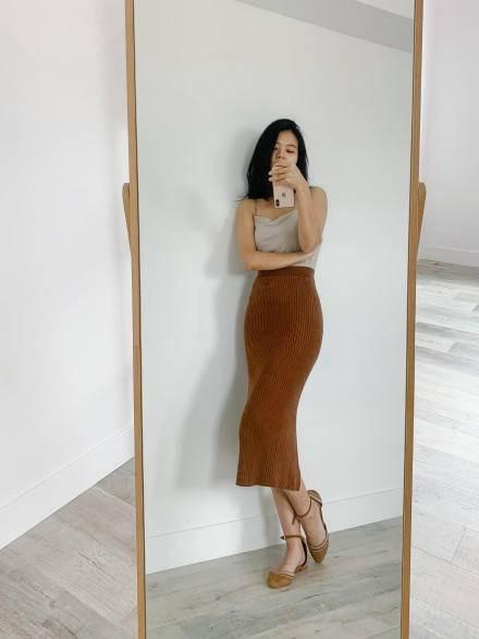 熟龄女性最大的魅力来自阅历提升带来的自信和优雅,年龄在沉淀的同时我们的穿衣风格也要稳步上升。这款修身包臀裙,最大程度的弱化熟龄女性体型改变问题,突出女性的柔美线条,针织面料在春天乍暖还寒的温度里宜室宜家,搭配灰色吊带,知性成熟的气场扑面而来,小编建议不是肩宽跨粗的姐妹千万不要尝试,怕你太好看了会影响交通。