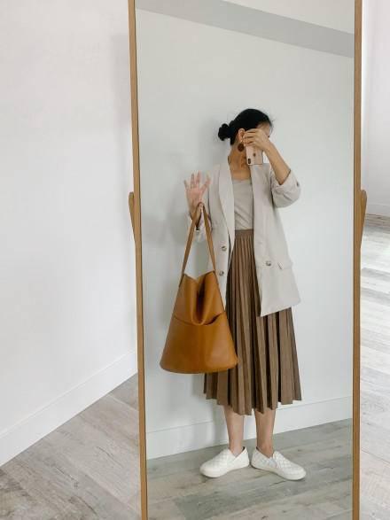 休闲西装同样适用在森女系的穿搭中,掌握好明暗配比的层次感,职场上温柔有气质的“明星助理”就是你。使用版型宽松的浅色休闲西装和同色系v领内搭,深棕百褶裙提高腰线,加重森女气息,亮眼的橘色宽挎包加深存在感,职场和日常都适用。