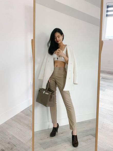 时尚圈里最常见的西装加运动背心搭配也是经久不衰,这样的搭配不仅适用于闺蜜出街,也适用在职场办公,西装的挺括增加了女性硬朗英气,九分裤和高跟鞋的搭配,简约大气,如果喜欢保守风格的姐妹也可以试试紧身v领的内搭,毕竟不是所有人都能hold住运动背心的造型。