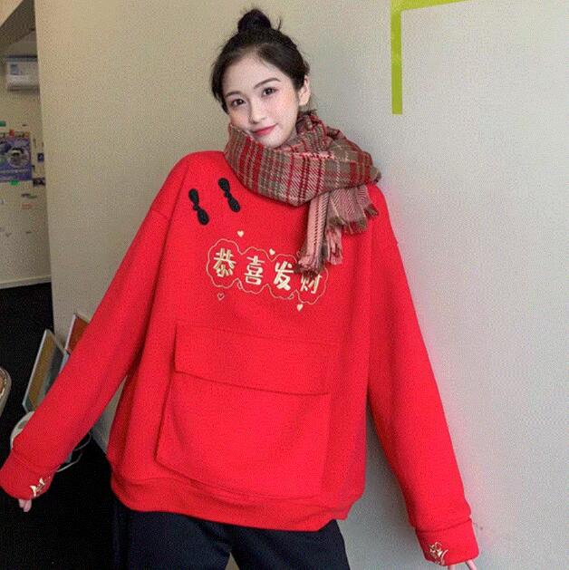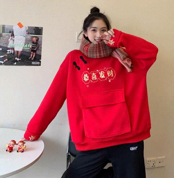 这件卫衣特色最鲜明的地方就是胸前金色的刺绣和刺绣下面的大口袋了,这个口袋过年用来装红包和糖果是最合适不过的了。但是因为这件卫衣的版型非常宽松,所以不太适合搭配大衣,会显得过分拖沓和臃肿,还是穿棉服或者是羽绒服更加合适一些哦。上一篇:冬季衣服搭配图片女生下一篇:女生不会穿搭衣服怎么办?过年穿什么衣服最好看图片