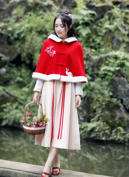现在很多仙女也非常喜欢中国风元素的服装,大街小巷随处可见,比如这一套红色的套装。由一条杏色的连衣裙和一件红色的小斗篷组成的。这件斗篷长度比较短,和普通外套一样,穿起来也不会觉得不方便。斗篷颜色是非常鲜艳的红色,很适合过年的时候穿,斗篷上还绣着非常可爱的小白兔,少女心满满。