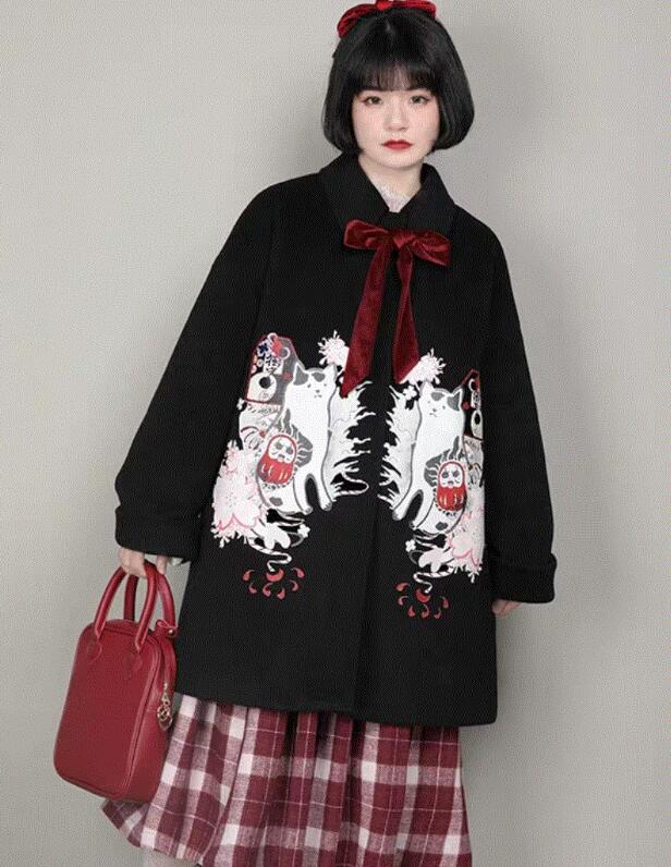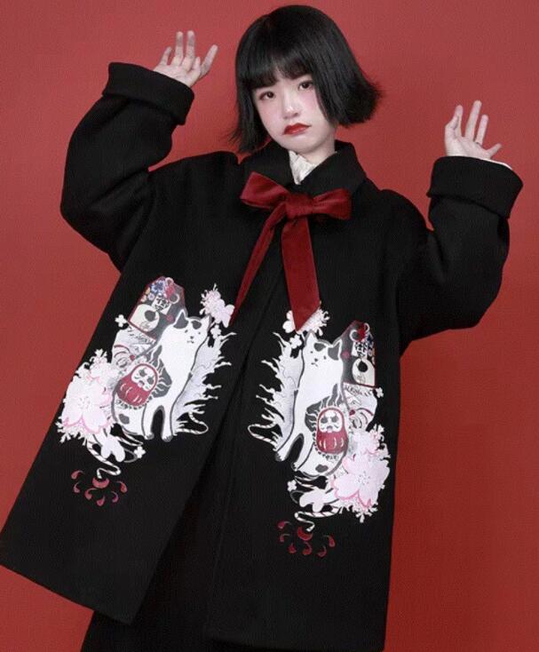 如果你觉得红色的衣服太过于鲜艳,不敢轻易尝试,也可以尝试一下这件黑色的大衣,这款大衣典型是为小个子的女生设计的,整体的版型都是可爱乖巧的感觉,像是一条短裙的感觉。在衣服两侧分别印有相同的白色幽灵的印花图案,又增加了这款衣服的个性感,也可以彰显青春美少女的小小叛逆风。领口之下的酒红色的丝带扎成蝴蝶结的造型,可爱的感觉瞬间迸发,而且也增加了不少喜庆的气息。