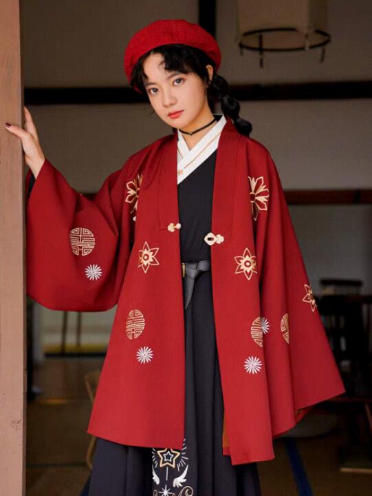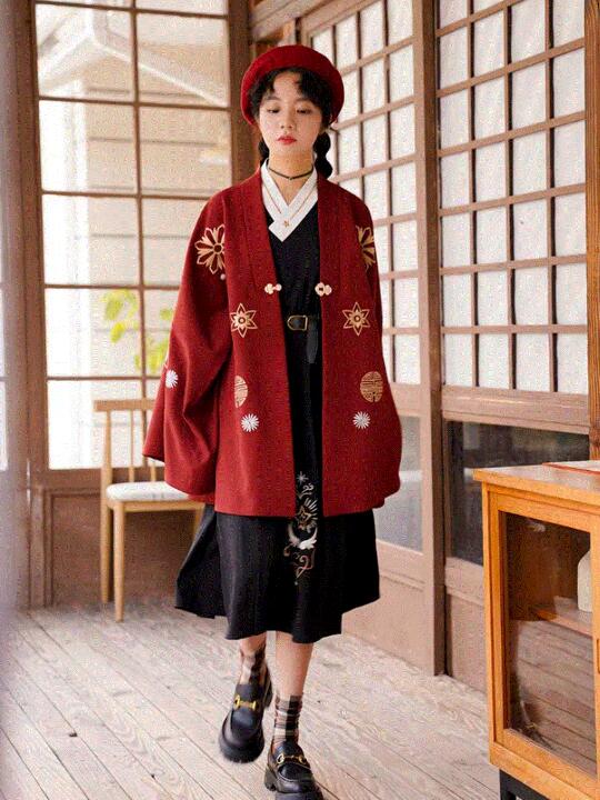 内搭的连衣裙保留了汉服非常传统的交领右衽的设计,黑白配色经典又百搭。腰间搭配一根黑色的皮带,显得非常英气。外搭的红色褙子也是非常喜庆的,在衣服上还有很多金色的烫金图案,就算是日常穿也没有关系哦。