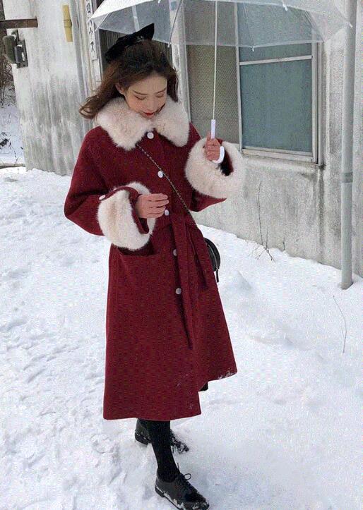 冬天穿一件毛呢大衣是最合适的了,这件酒红色的长款毛呢大衣看起来就有一种非常雅致,非常高贵的感觉。这件大衣的颜色并没有正红色看起来那么鲜艳招摇,反而蕴含着一种低调的美感。大衣的面料非常厚实,在领口和袖口的位置都有非常蓬松的毛毛作为装饰,这种装饰也让这件大衣看起来暖和了不少。
